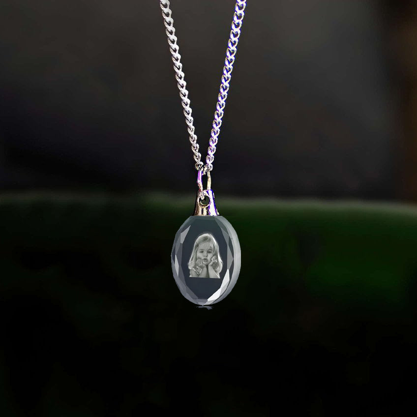 قلادة كريستالية بتصميم دمعة أنيق، محفورة بالليزر بدقة داخل الكريستال لتبرز تفاصيل نقشك الخاص بوضوح وجمال. تضفي هذه القلادة لمسة من الرقي والتميز على إطلالتك، مما يجعلها قطعة مثالية تعبر عن ذوقك الشخصي وترافقك بأناقة في كل مناسبة.